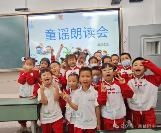 对于刚踏入校园的一年级孩子而言,兴趣是开启表达之门的钥匙。“童谣伴我乐开怀”活动以韵律为媒,让孩子们在诵读与吟唱中感受语言的灵动之美。“童谣朗读会”上,孩子们挣脱羞涩与胆怯,带着夸张的动作、鲜活的表情大声朗读《对韵歌》《小白兔》等经典童谣,稚嫩的童声搭配可爱的肢体语言,让教室里充满欢声笑语;课堂上,老师们带领大家学唱简单童谣,在轻快的节奏中培养语感,每个孩子都勇敢站上小舞台,用纯粹的童真展示表达的热情,在快乐互动中迈出了语言表达的第一步。