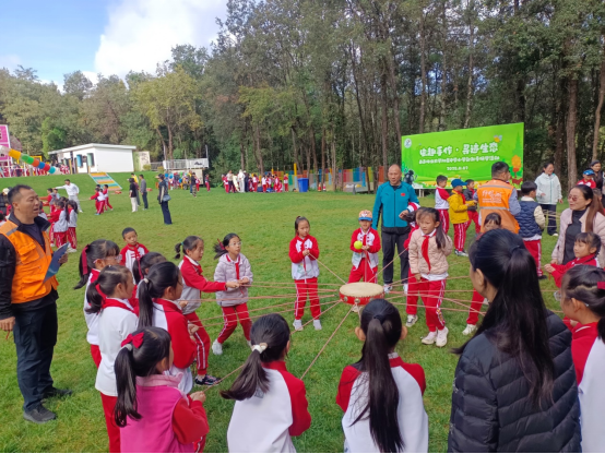 五、六年级的同学们将团建游戏作为活动的开场,在 “鼓动人心”和“毛毛虫” 游戏中,大家齐心协力,培养了团队合作精神。在“鼓动人心”游戏中,同学们拉着一根绳子,绳子上系着一个鼓,大家要通过控制绳子的力度和方向,让鼓上的球跳动起来,并且尽量不让球掉下来。一开始,大家的节奏不太一致,球总是掉下来,但是同学们没有气馁,不停地商量着、调整着,慢慢地找到了默契。当球在鼓上连续跳动很多次的时候,大家都激动地欢呼起来:“我们成功啦!”